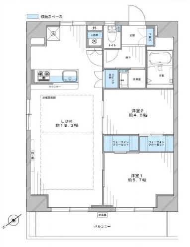 | 間取り詳細 | LDK約18.3帖、洋室(1)約5.7帖、(2)約4.8帖 |