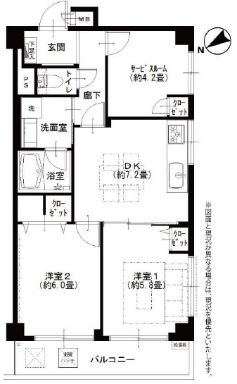 | 間取り詳細 | DK約7.2帖、洋室(1)約5.8帖、(2)約6.0帖 サービスルーム約4.2帖 |