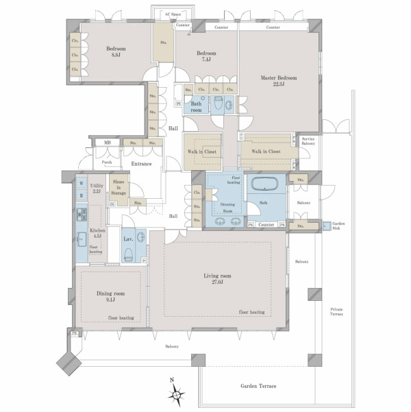 | 間取り詳細 | リビング約27.4帖、ダイニング約9.1帖、洋室(1)約22.3帖、(2)約8.8帖(3)約7.4帖、 |