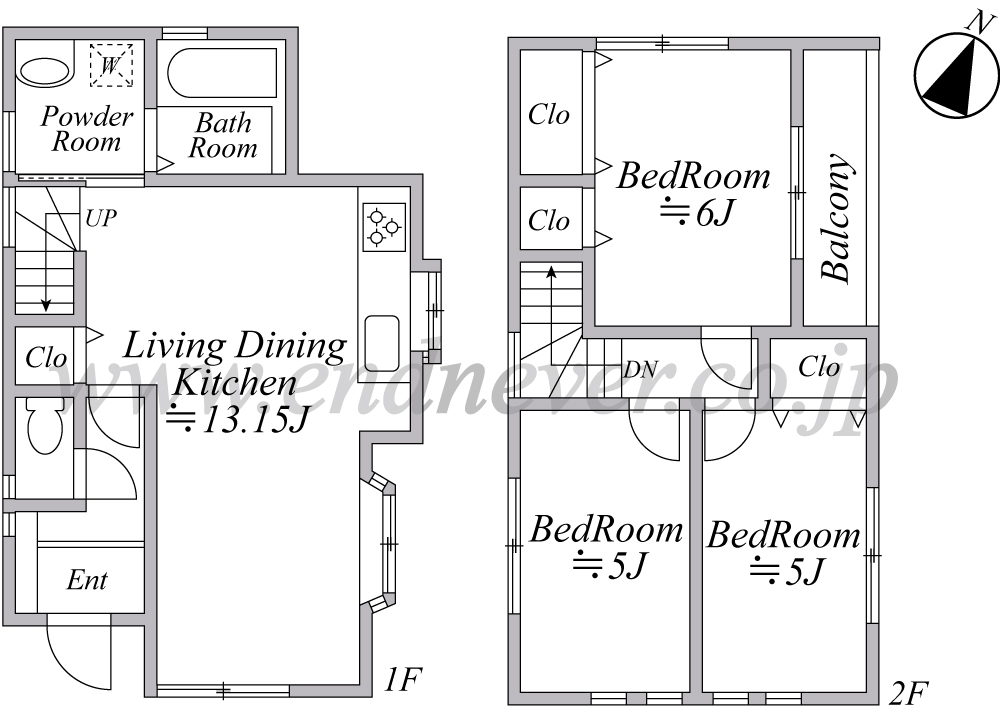 | 間取り詳細 | 1F LDK約13.15帖、 2F洋室(1)約6.0帖、(2)約5.0帖、(3)約5.0帖 |