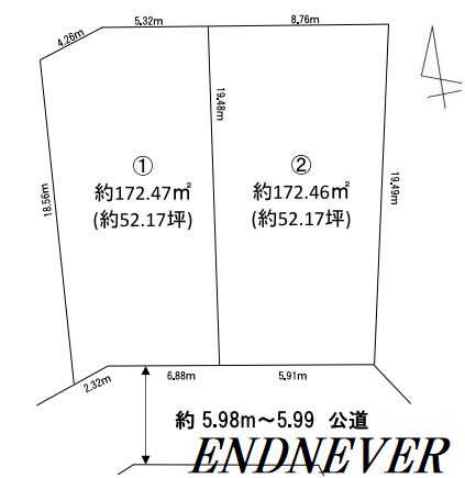 | 土地面積 | ①約172.47㎡(約52.17坪) ②約172.47㎡(約52.17坪) |